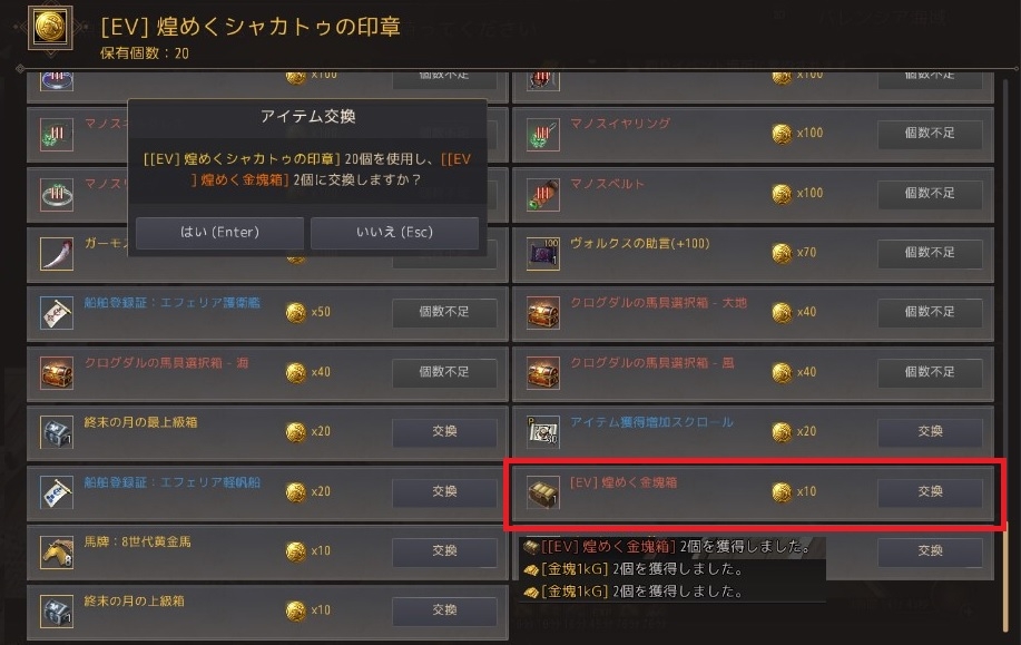私は20枚余ってたので、煌めく金塊箱を2箱交換しました。
