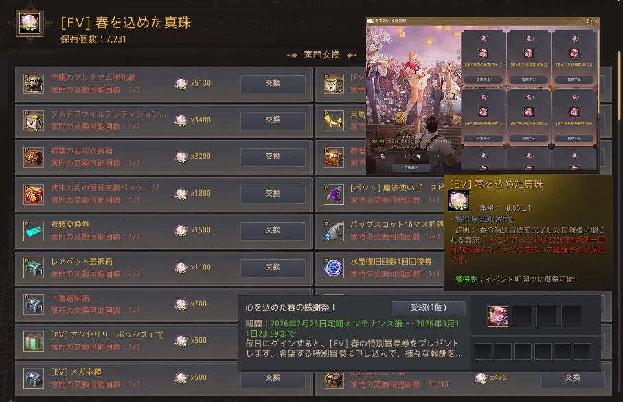 メンテから24時間経過時の、春を込めた真珠数は7231個。