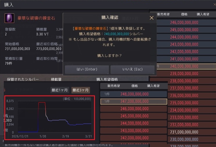 で、実装からしばらく、破壊の錬金石の価格を時々眺めてました。