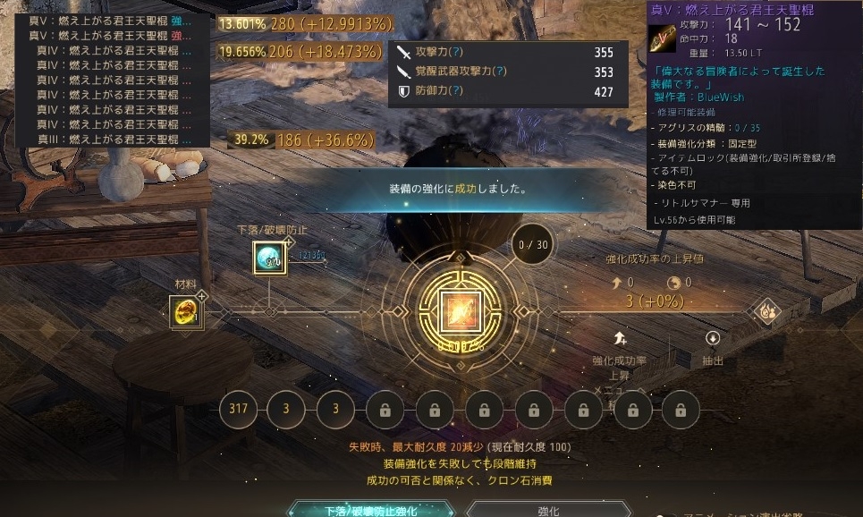 それで、アグリス7回の時点から強化開始して、おそらく2回目で成功したと思う。