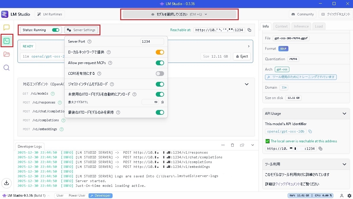 続いて、画面上部のモデル選択で、GPT-OSS-20Bかなんかをロード。