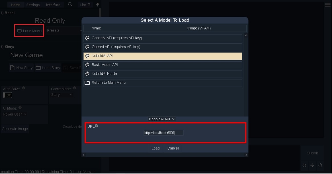 KoboldAI APIを選択。URLに「http://localhost:5001」を入力。