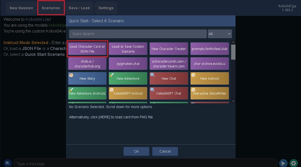 ブラウザ側で、左上のシナリオを選んで、キャラロードしたら遊べます。
